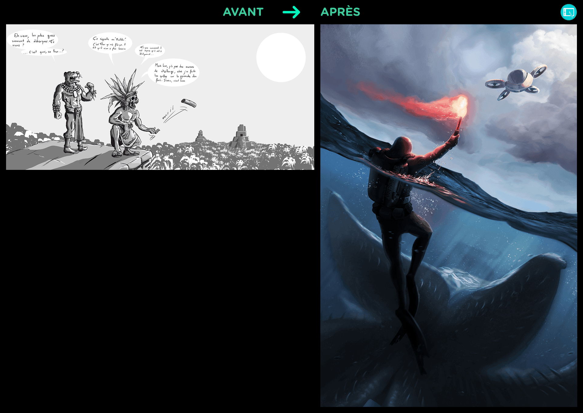 Les avant/après sont proposés par les élèves eux même. A la fin des cours dans le dernier Chapitre, chaque élève est invité à reproduire son illustration de référence réalisé au 1er chapitre.